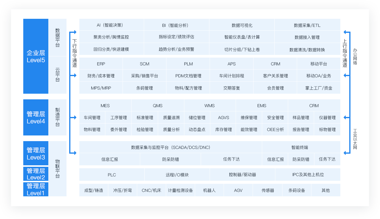通過工業(yè)網(wǎng)絡(luò),縱向打通企業(yè)層、管理層、操作層、控制層設(shè)備層數(shù)據(jù)鏈路,實(shí)現(xiàn)數(shù)據(jù)的雙向互通,實(shí)時(shí)共享。下層物聯(lián)平臺(tái),實(shí)現(xiàn)設(shè)備聯(lián)網(wǎng),實(shí)時(shí)采集生產(chǎn)設(shè)備、物料數(shù)據(jù)數(shù)據(jù);中層智造平臺(tái)實(shí)現(xiàn)生產(chǎn)過程各環(huán)節(jié)及要素的精細(xì)化管控;上層云平臺(tái)、數(shù)據(jù)平臺(tái)實(shí)現(xiàn)資源管控和共享服務(wù),基于數(shù)據(jù)持續(xù)精益改善?
